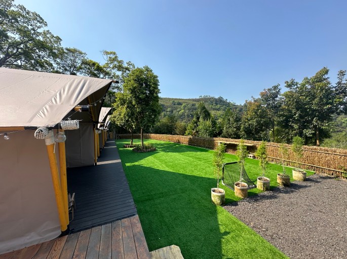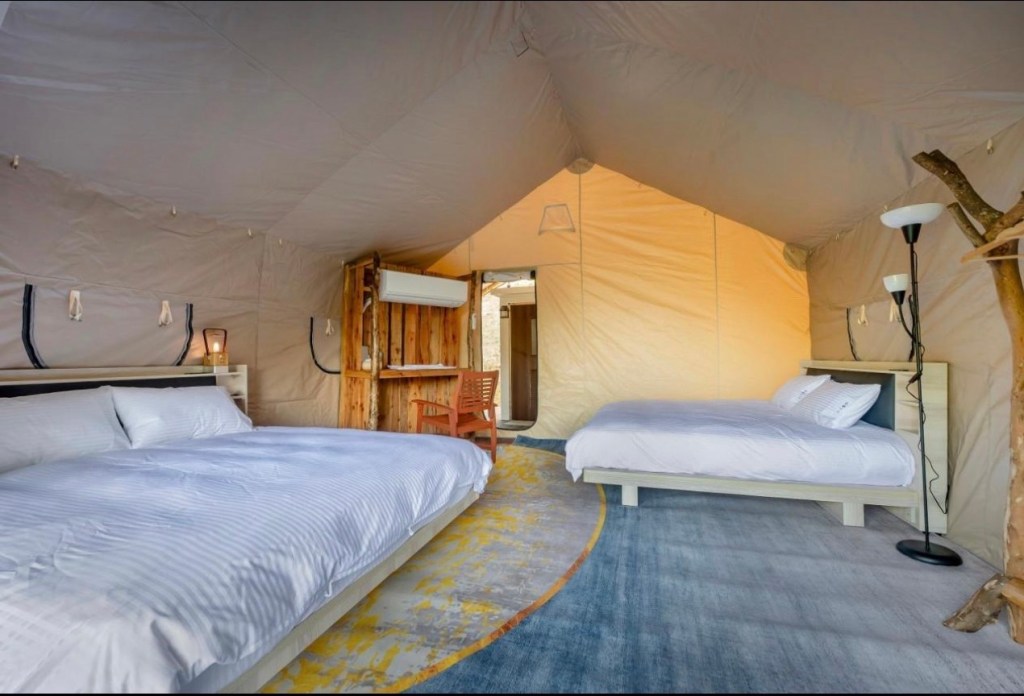 雙床KING尺寸房型搭配大金冷暖器,衛浴空間在帳篷後面步行3步即可到達。
